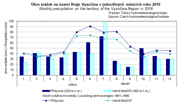 Graph 2. Monthly precipitation on the territory of the Vysočina Region in 2016