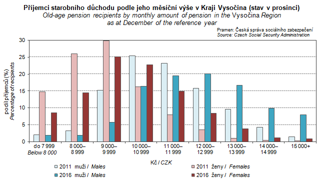 Graph 38. Old-age pension recipients by pension monthly amount in the Vysočina Region (as at December)