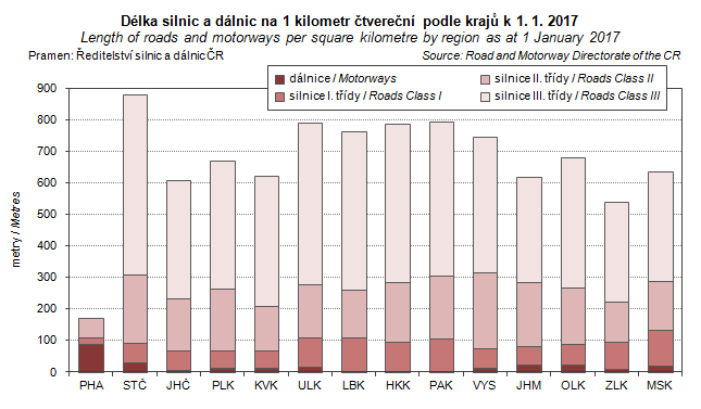 Graph 35. Length of roads and motorways per square kilometre by region as at 1 January 2017