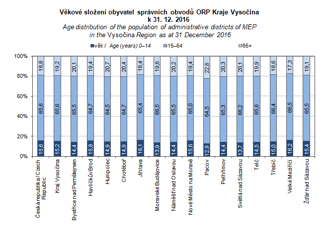 Graph 39. Age distribution of the population of administrative districts of MEP in the Vysočina Region as at 31 December 2016