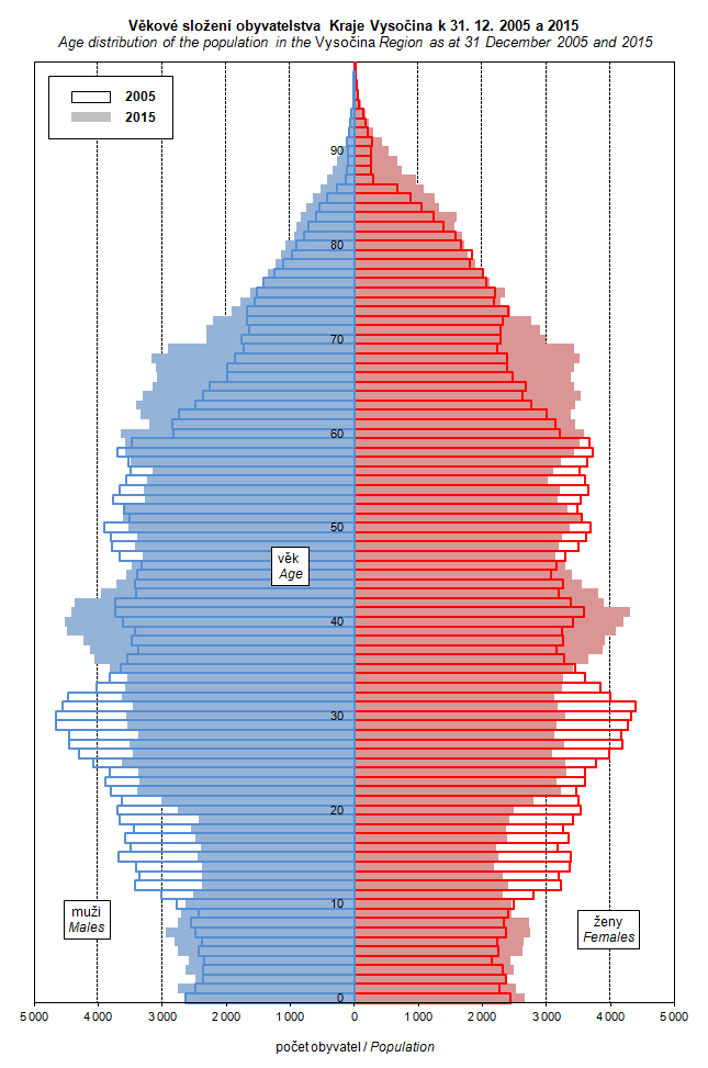 Graph 6. Age distribution of the population in the Vysočina Region as at 31 December 2005 and 2015