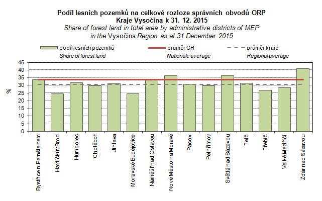 Graph 31. Share of forest land in total area by administrative districts of MEP in the Vysočina Region as at 31 December 2015