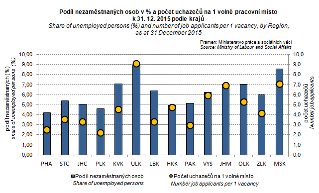 Graph 15. Share of unemployed persons (%) and number of job applicants per 1 vacancy, by Region, as at 31 December 2015