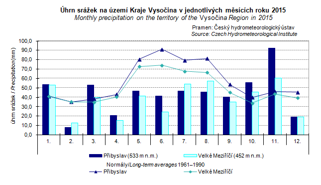 Graph 2. Monthly precipitation on the territory of the Vysočina Region in 2015