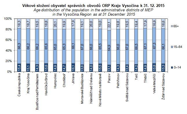 Graph 30. Age distribution of the population in the administrative districts of MEP in the Vysočina Region as at 31 December 2015