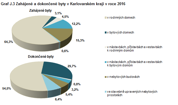 Tab. J.1 Zahájené a dokončené byty podle druhu stavby v Karlovarském kraji a jeho okresech