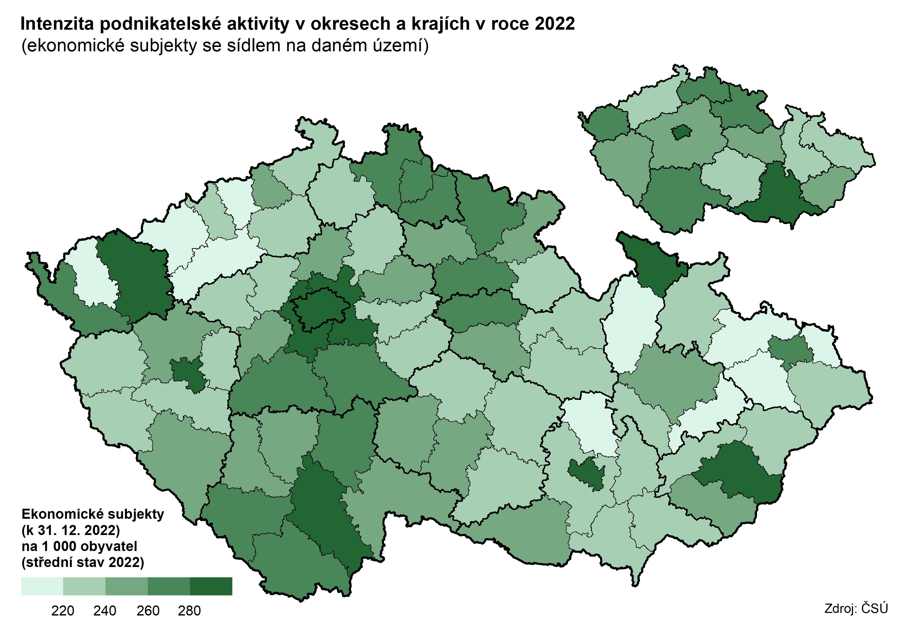 Intenzita podnikatelské aktivity v okresech a krajích v roce 2022
