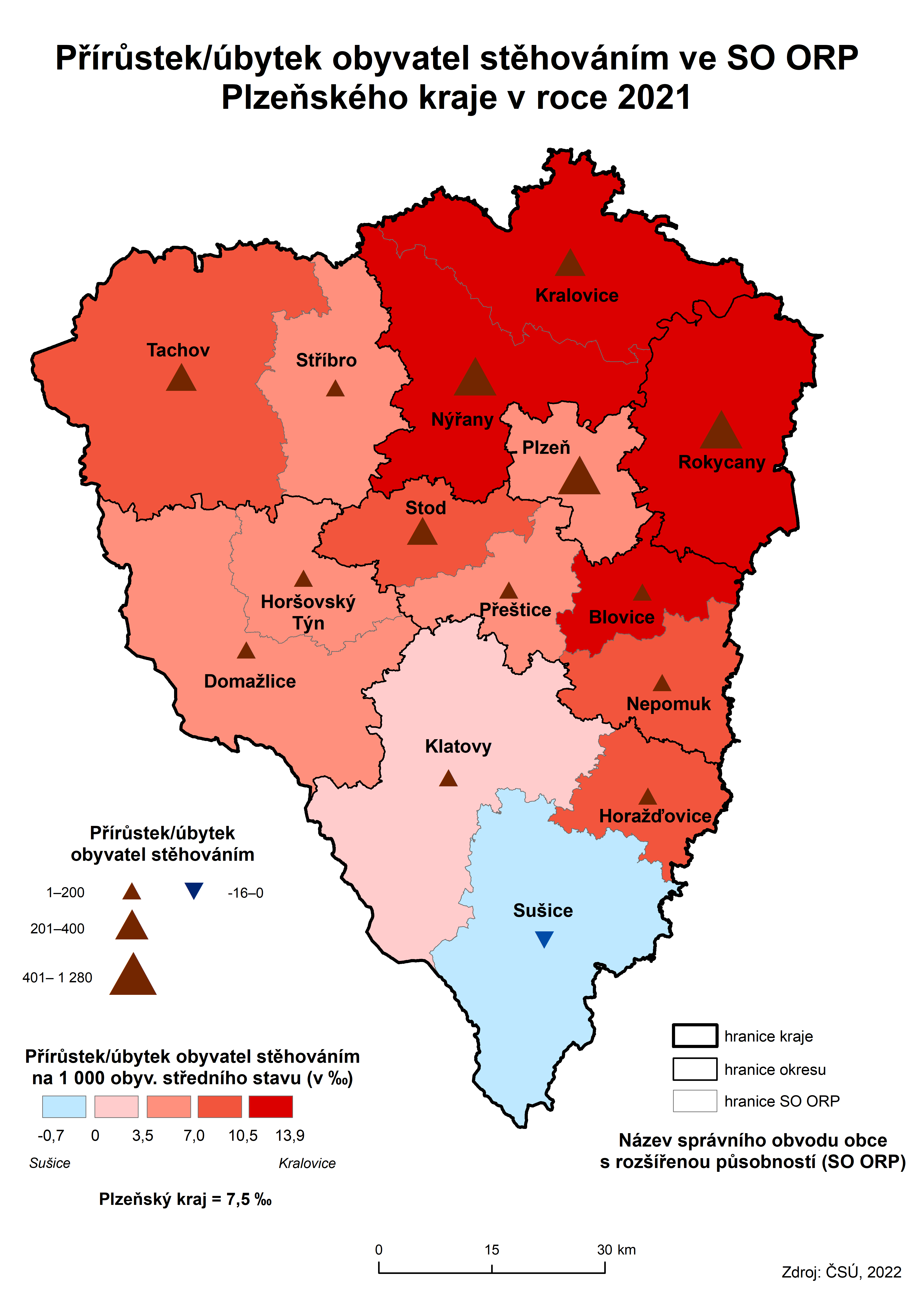 Přírůstek/úbytek obyvatel stěhováním ve SO ORP Plzeňského kraje