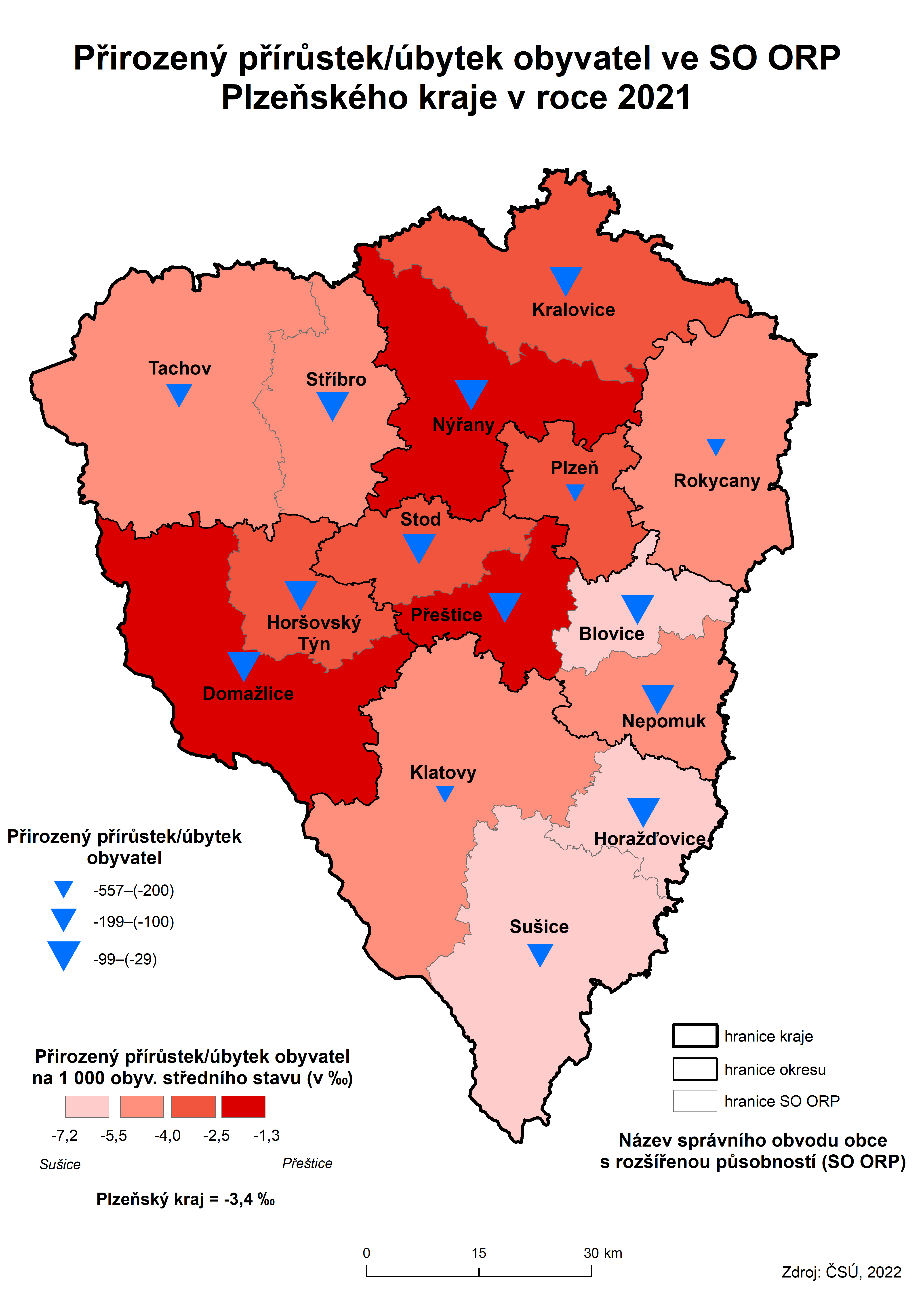 Přirozený přírůstek/úbytek obyvatel ve SO ORP Plzeňského kraje
