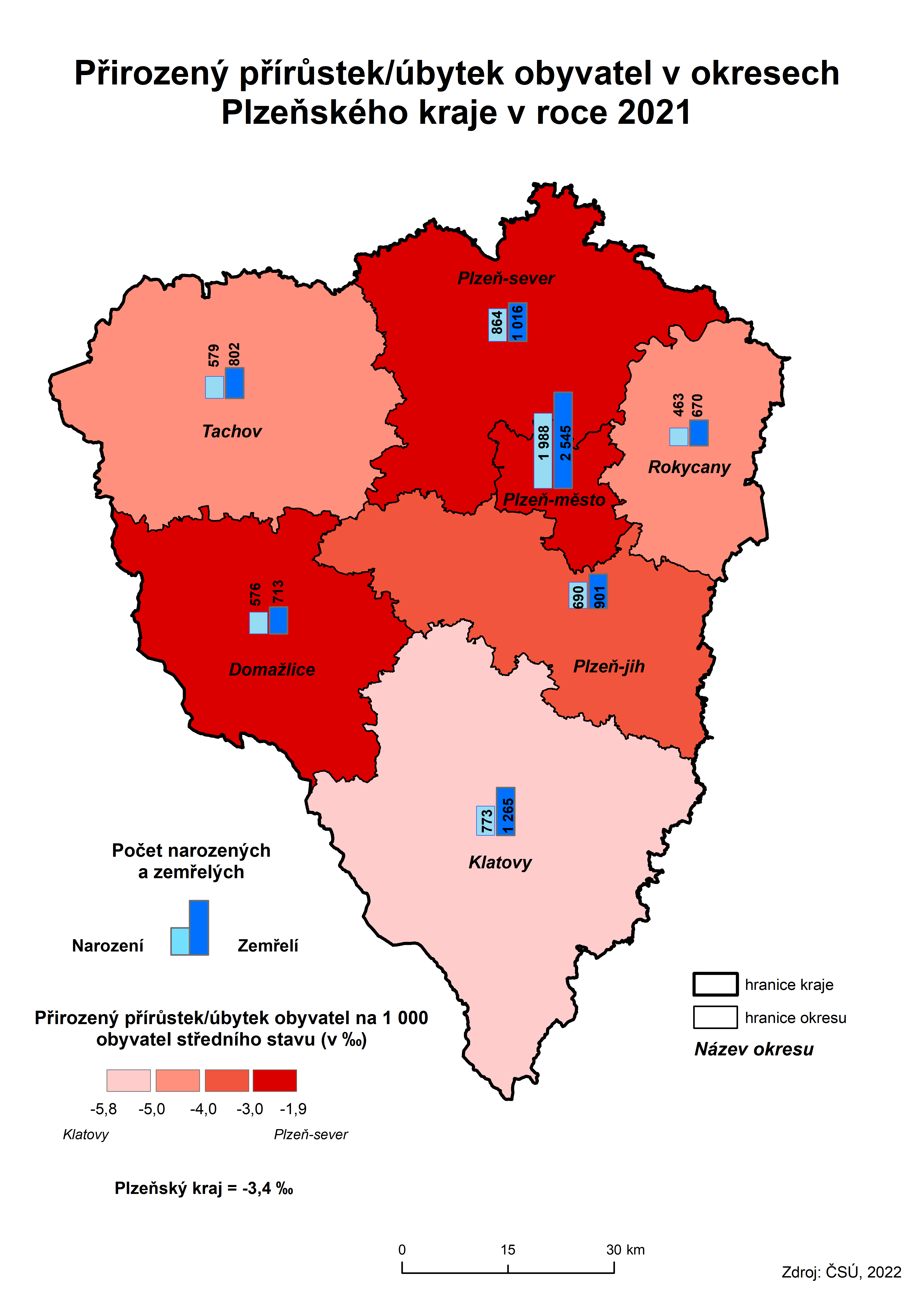 Přirozený přírůstek/úbytek obyvatel v okresech Plzeňského kraje