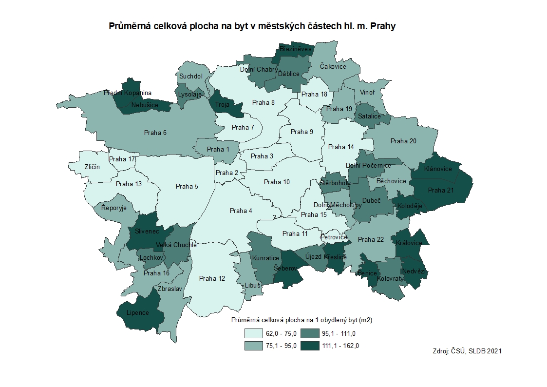 Průměrná celková plocha na byt v městských částech hl. m. Prahy