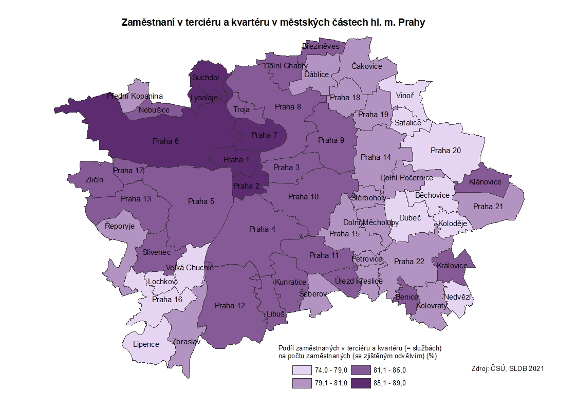 Zaměstnaní v terciéru a kvartéru v městských částech hl. m. Prahy