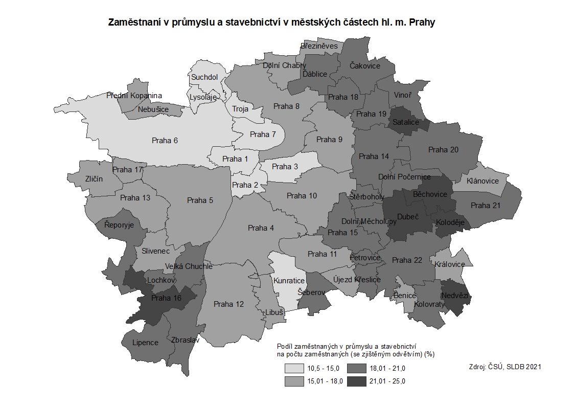 Zaměstnaní v průmyslu a stavebnictví v městských částech hl. m. Prahy