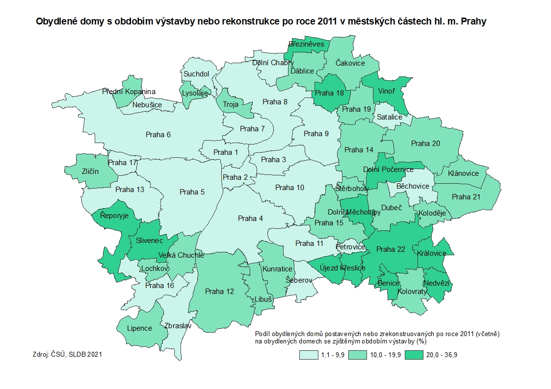 Obydlené domy s obdobím výstavby nebo rekonstrukce po roce 2011 v městských částech hl. m. Prahy