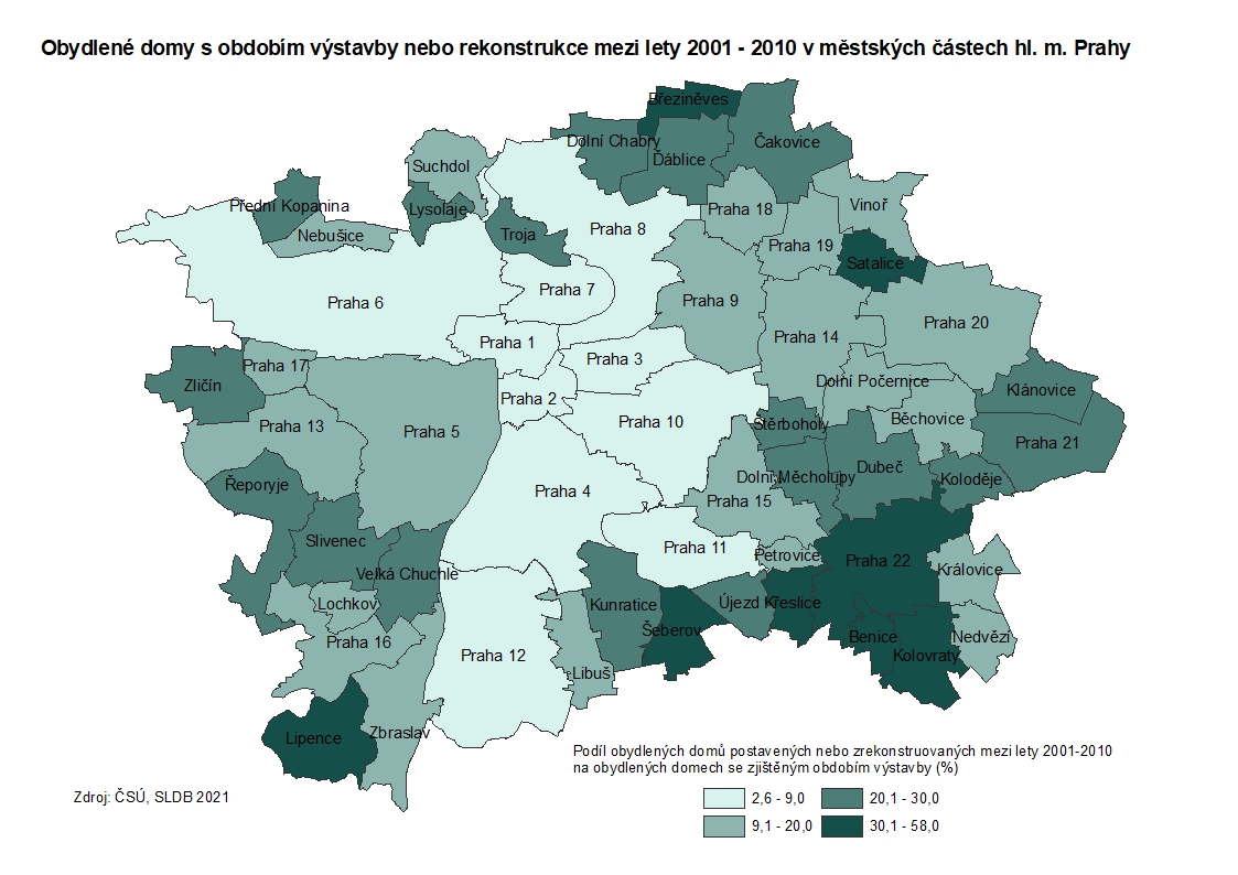 Obydlené domy s obdobím výstavby nebo rekonstrukce mezi lety 2001 - 2010 v městských částech hl. m. Prahy