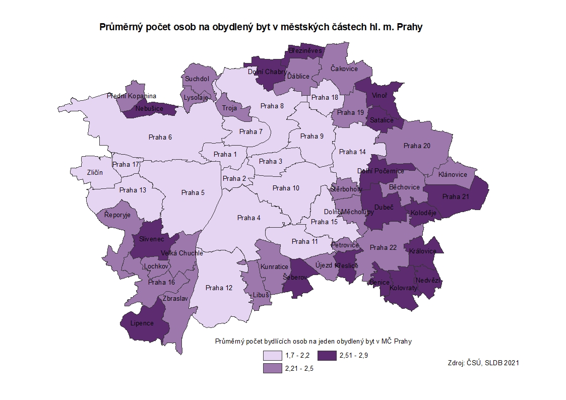 Průměrný počet osob na obydlený byt v městských částech hl. m. Prahy