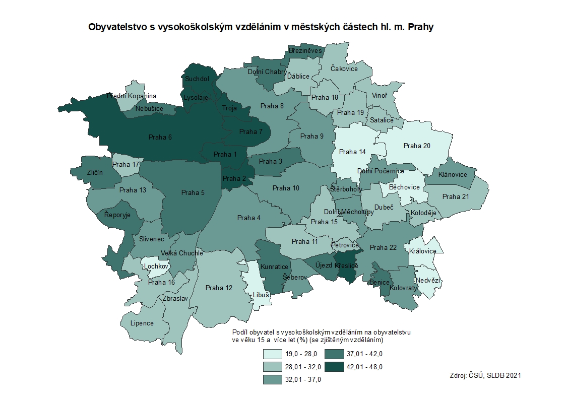 Obyvatelstvo s vysokoškolským vzděláním v městských částech hl. m. Prahy