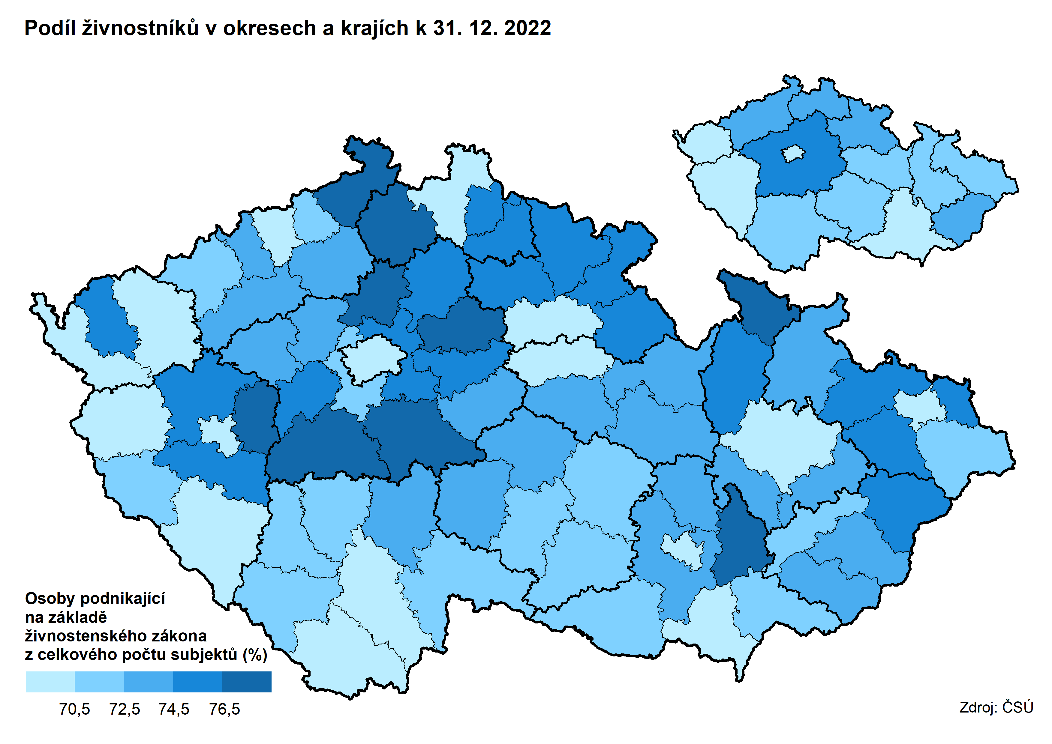 Podíl živnostníků v okresech a krajích k 31. 12. 2022