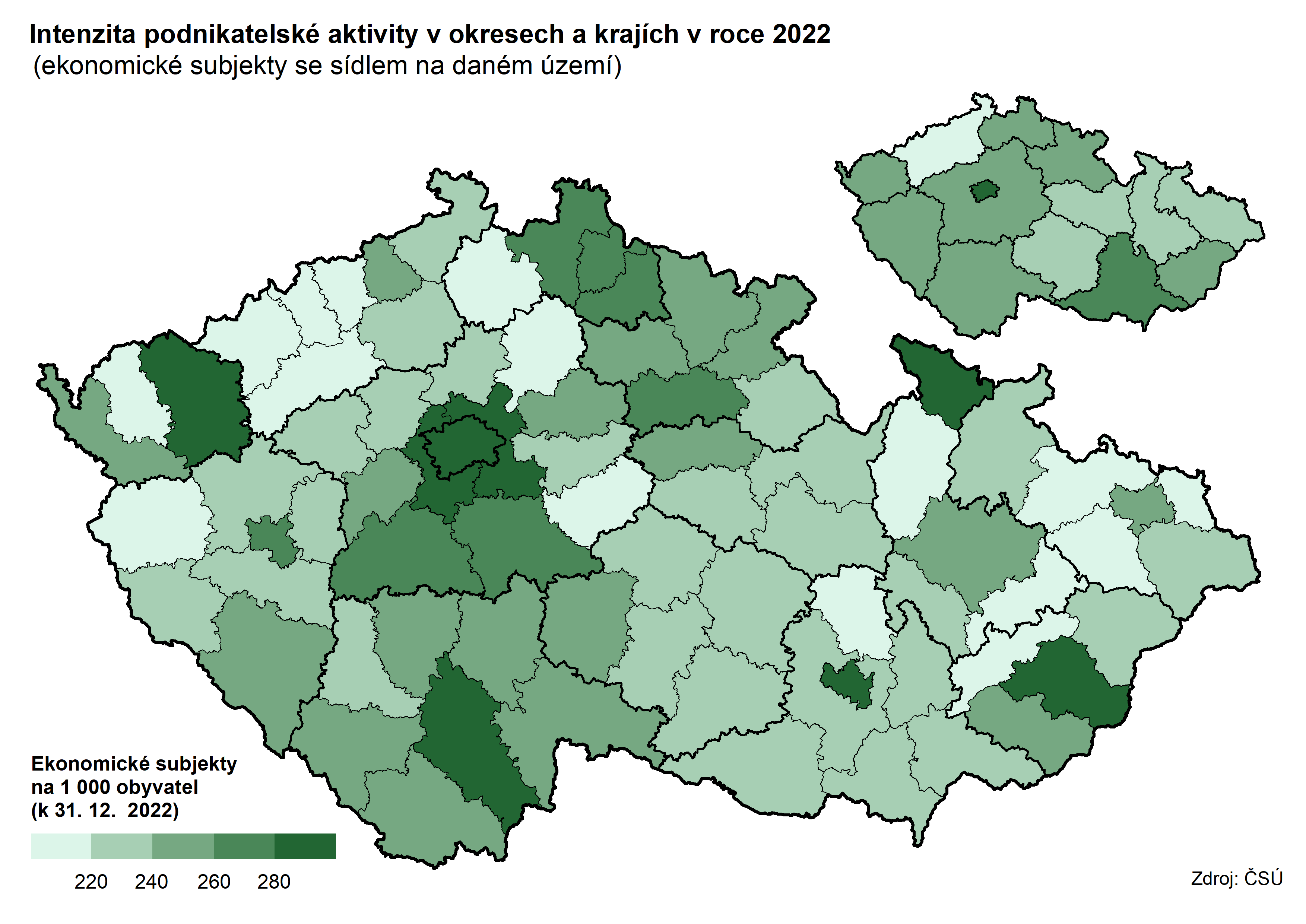 Intenzita podnikatelské aktivity v okresech a krajích v roce 2022