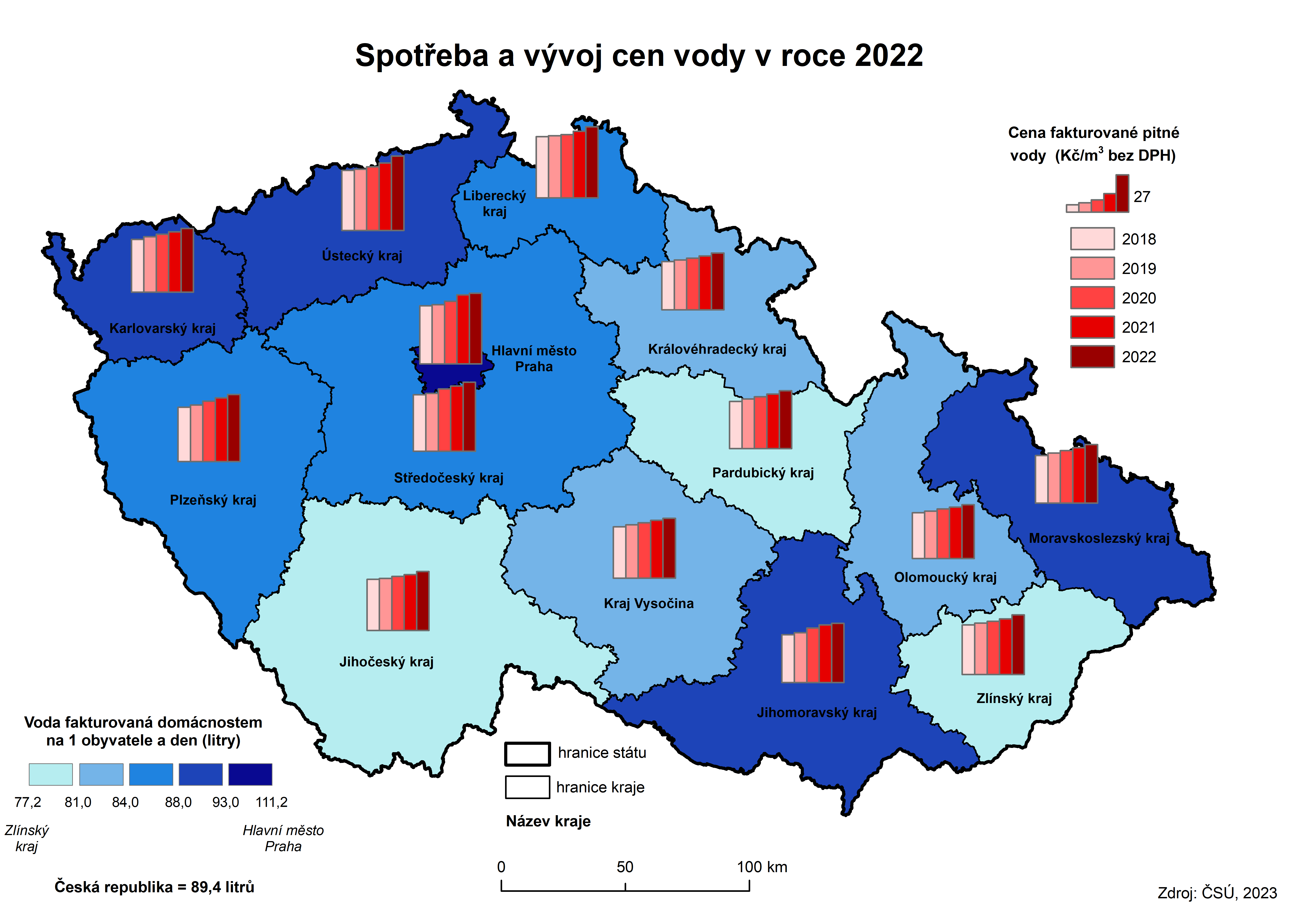 Spotřeba a vývoj cen vody v krajích v roce 2022