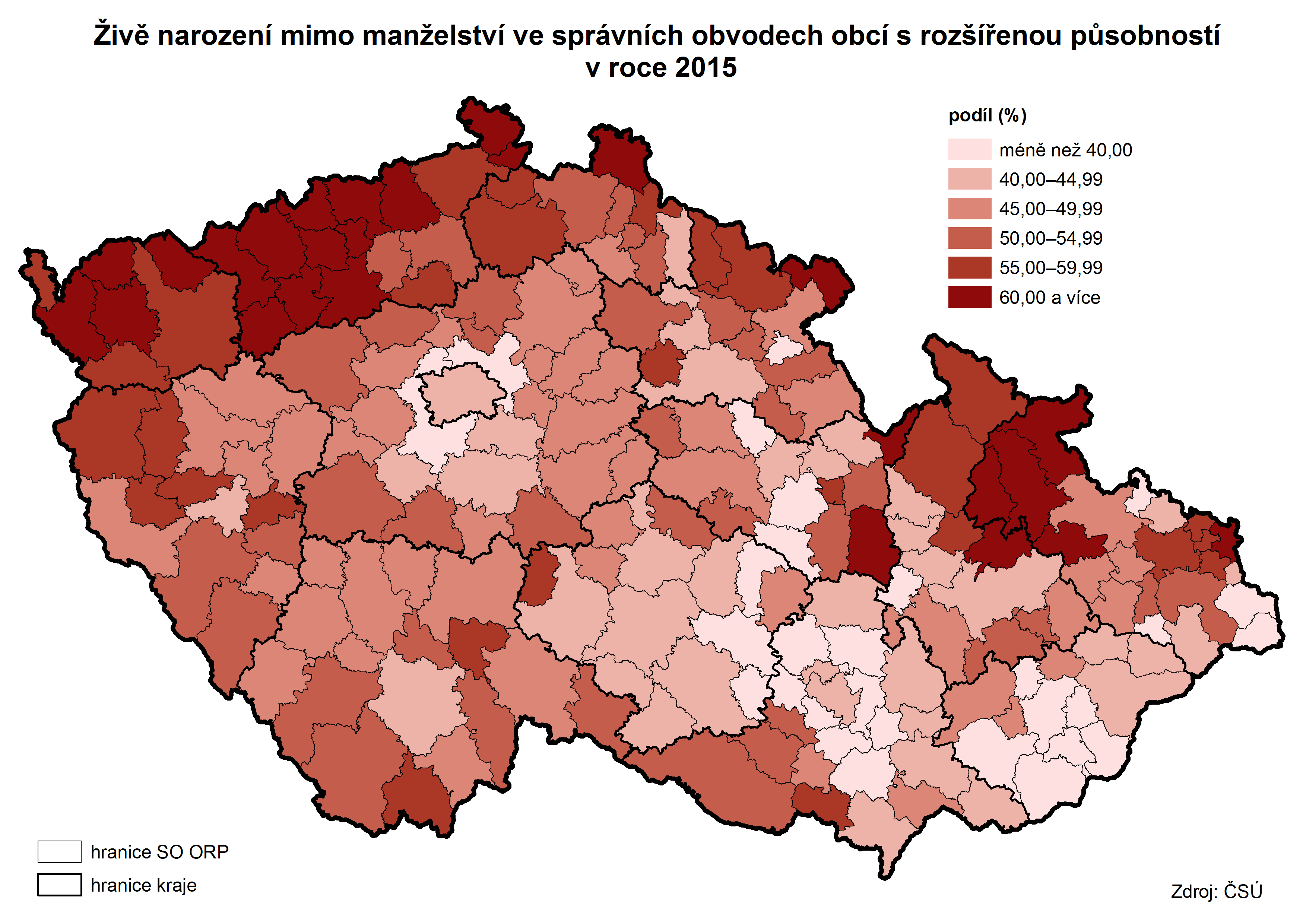 Živě narození mimo manželství ve správních obvodech obcí s rozšířenou působností v roce 2015