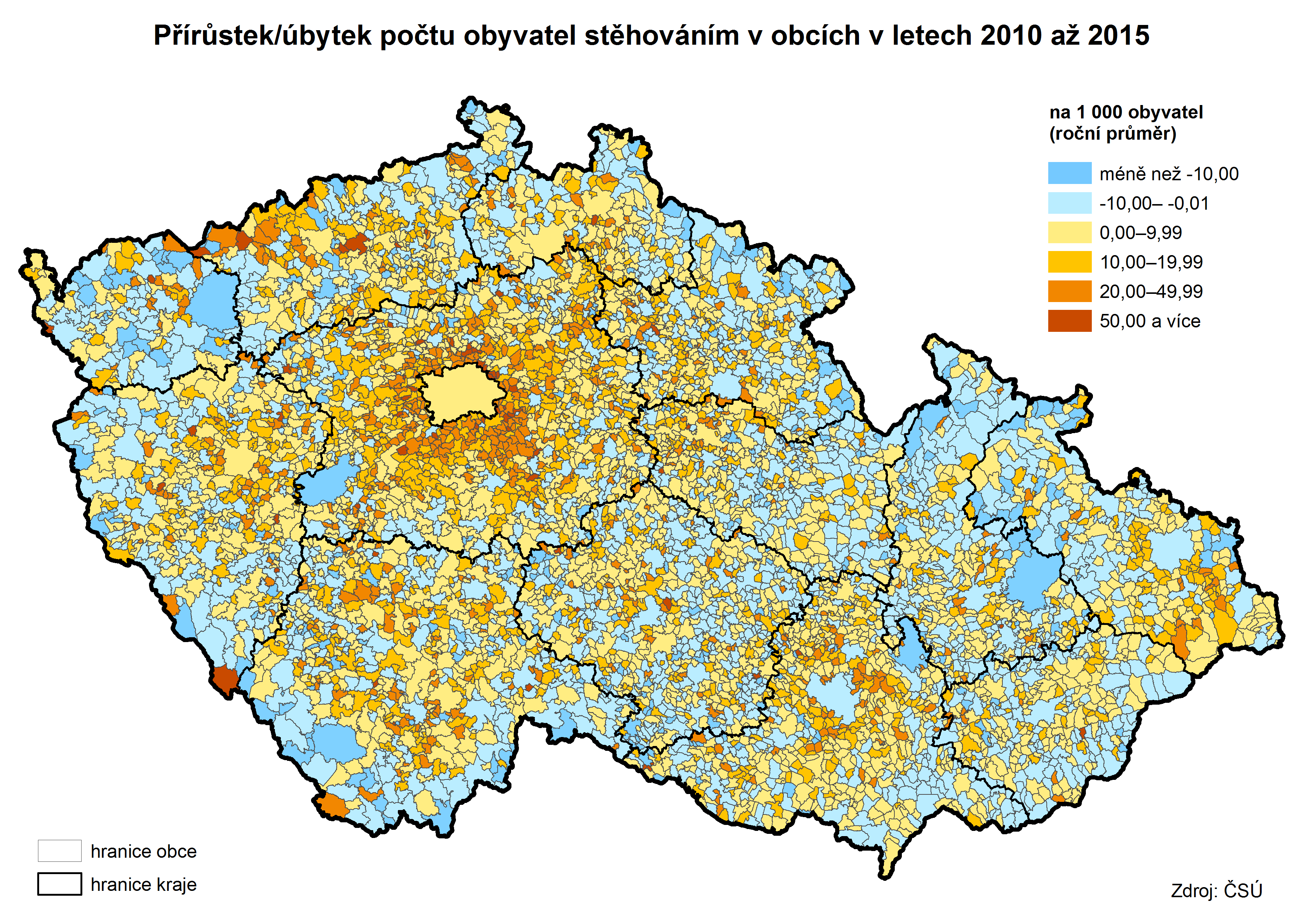 Přírůstek/úbytek počtu obyvatel stěhováním v obcích v letech 2010 až 2015