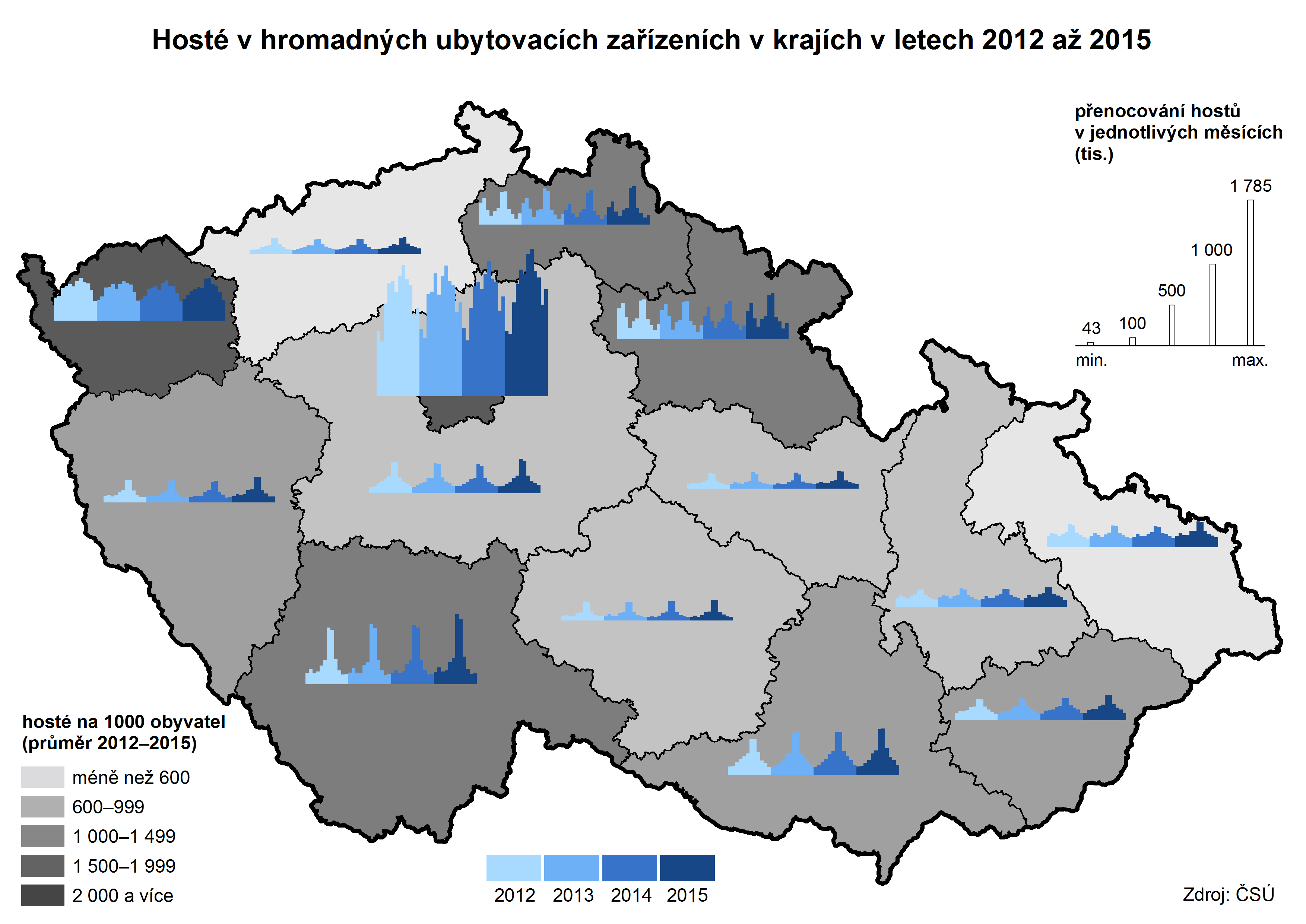 Hosté v hromadných ubytovacích zařízeních v krajích v letech 2012 až 2015