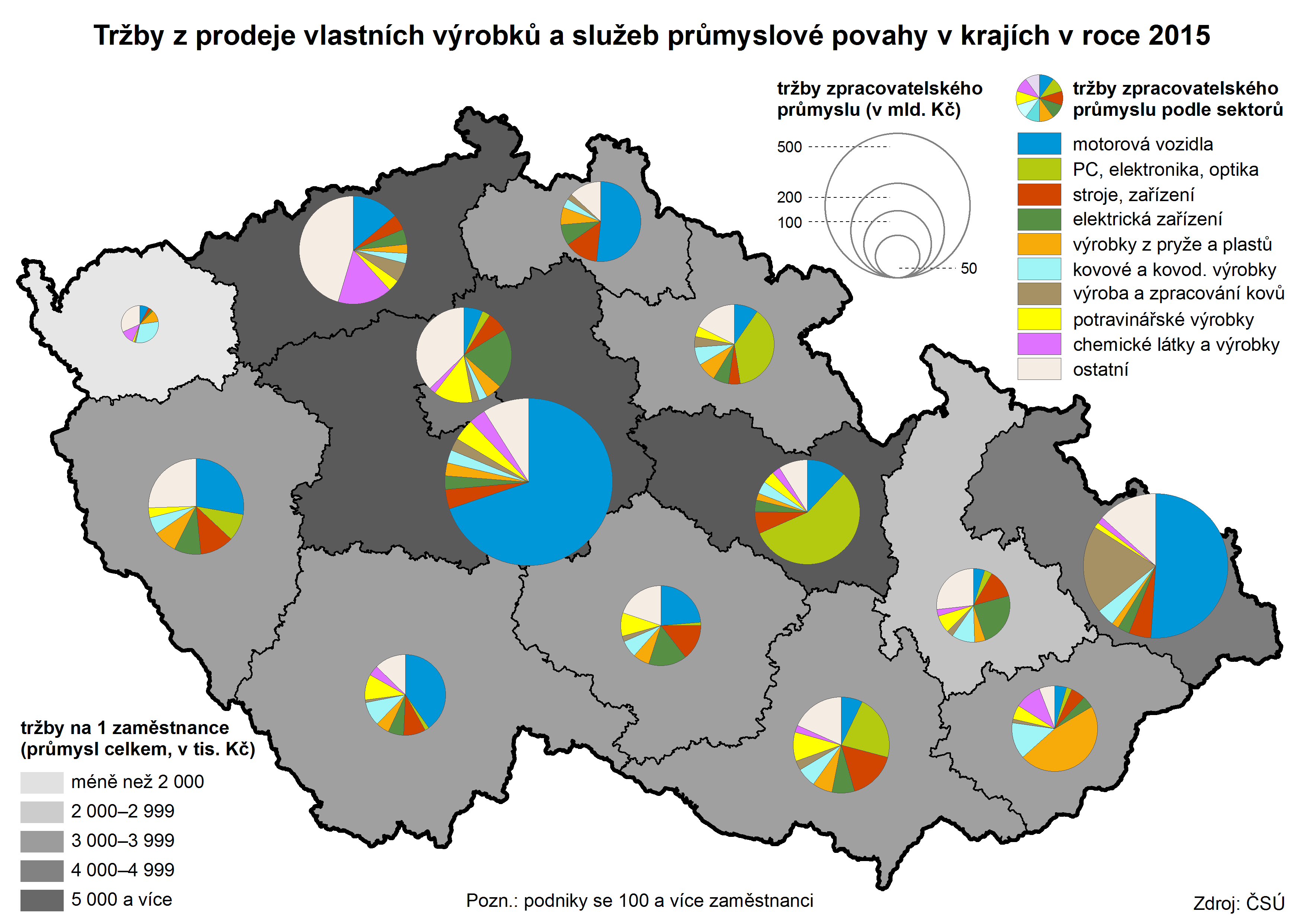 Tržby z prodeje vlastních výrobků a služeb průmyslové povahy v krajích v roce 2015