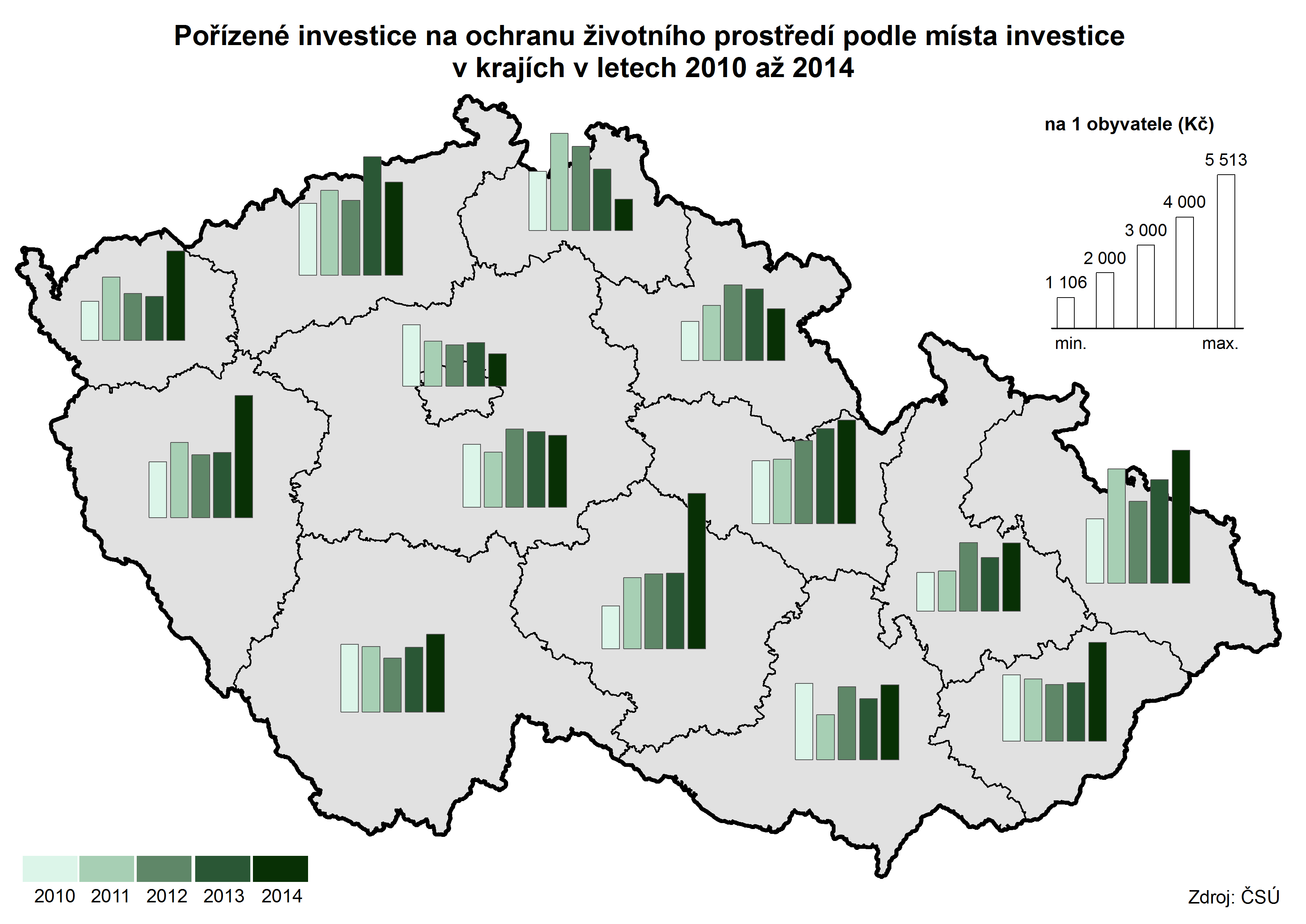 Pořízené investice na ochranu životního prostředí podle místa investice v krajích v letech 2010 až 2014