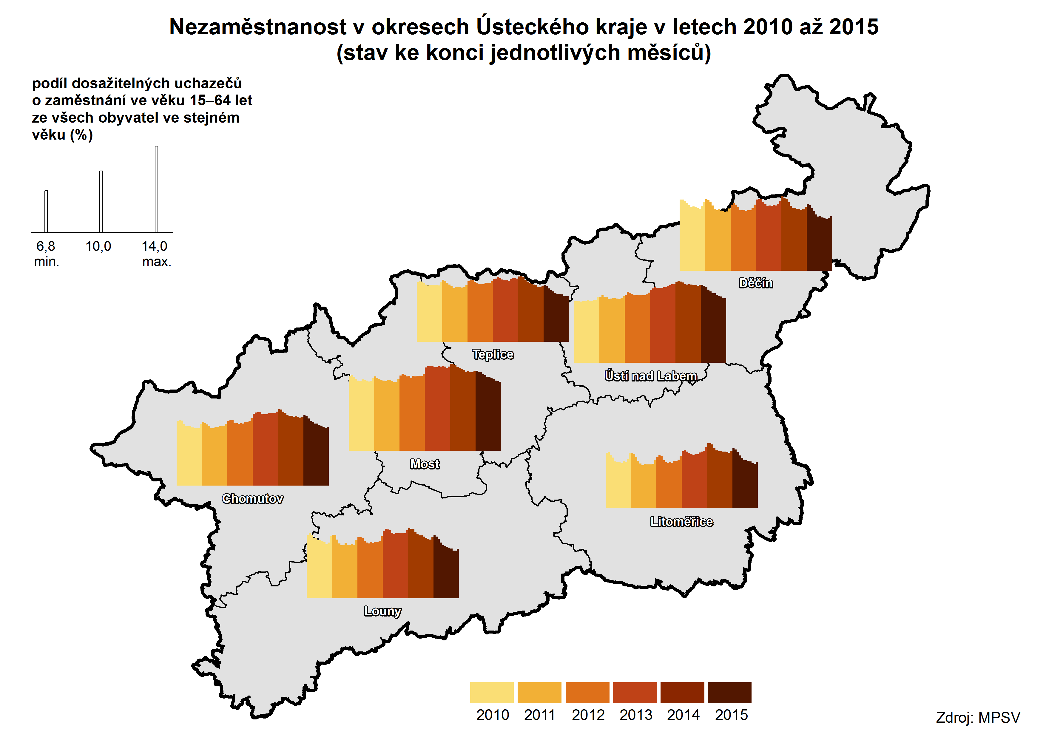 Nezaměstnanost v okresech Ústeckého kraje v letech 2010 až 2015 (stav na konci jednotlivých měsíců)