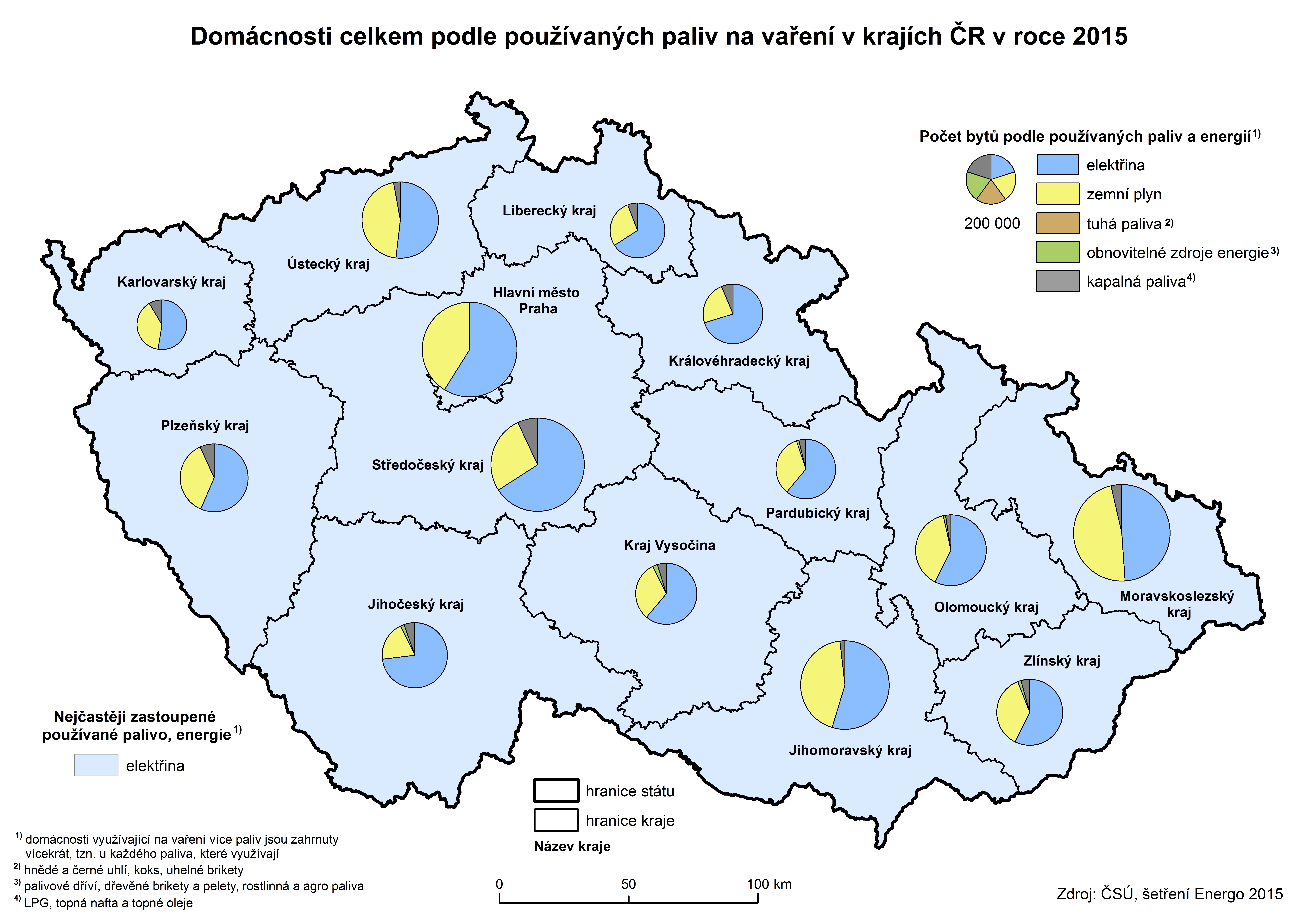 Domácnosti celkem podle používaných paliv na vaření v krajích ČR v roce 2015