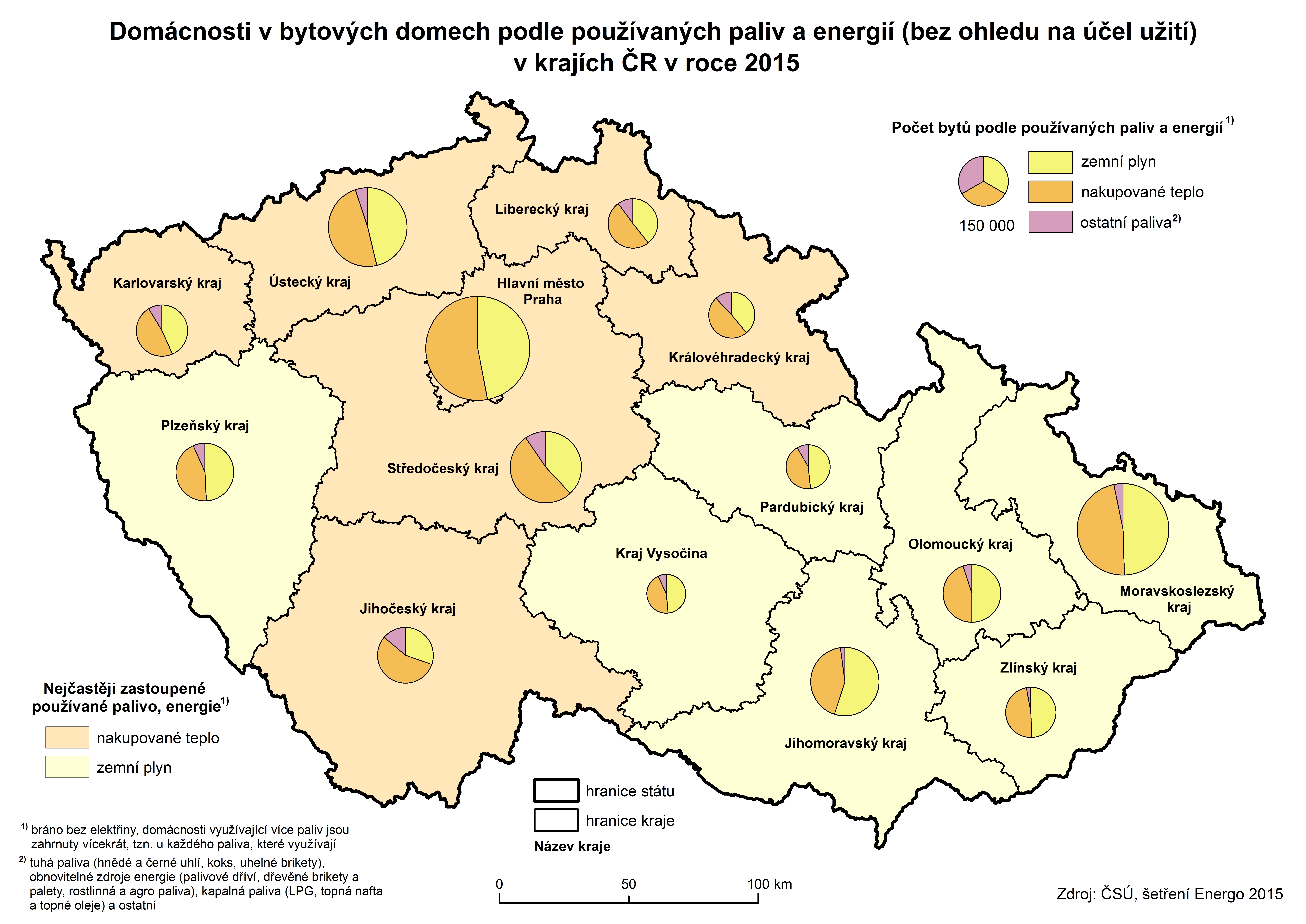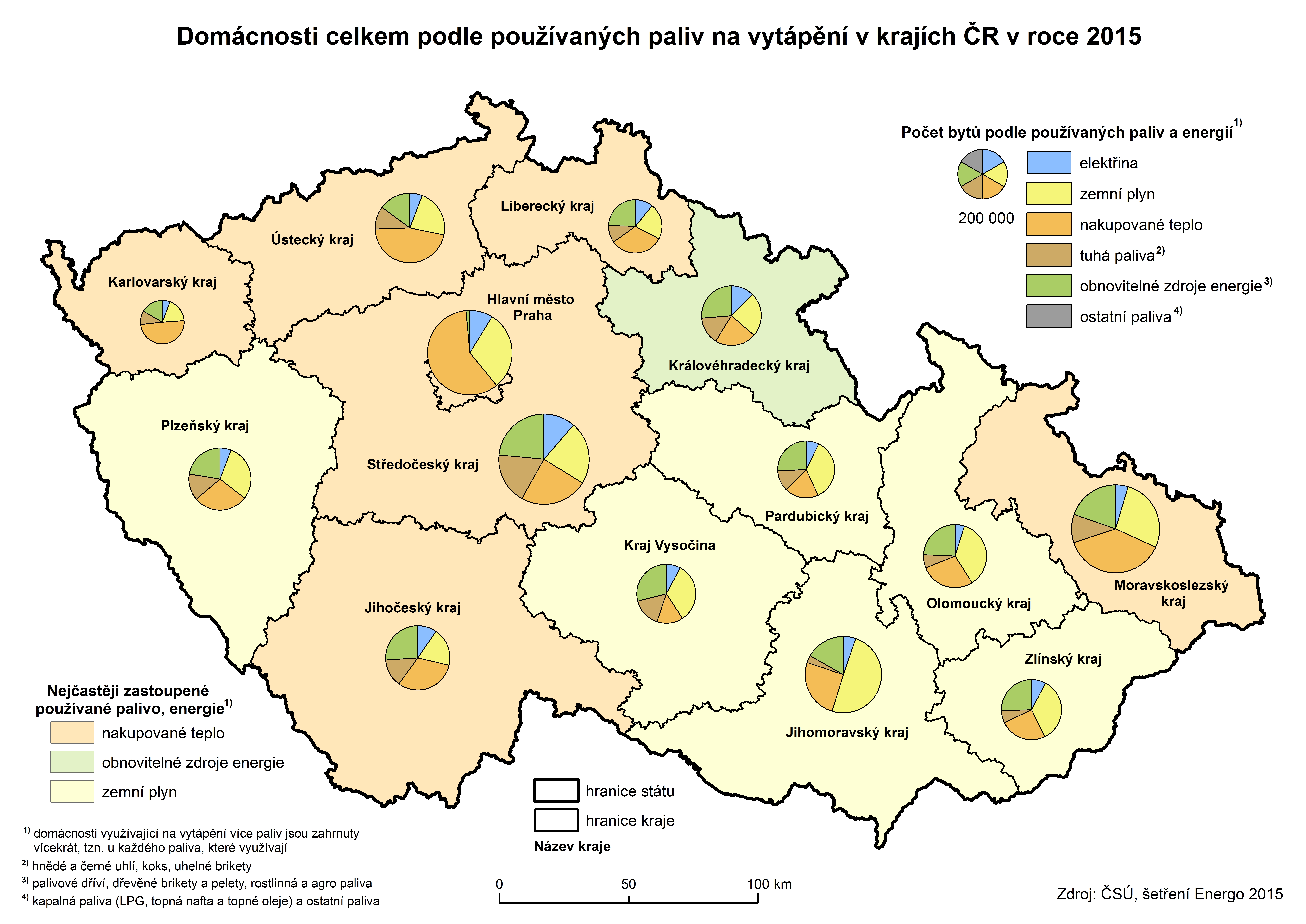 Domácnosti celkem podle používaných paliv a energií (bez ohledu na účel užití) v krajích ČR v roce 2015