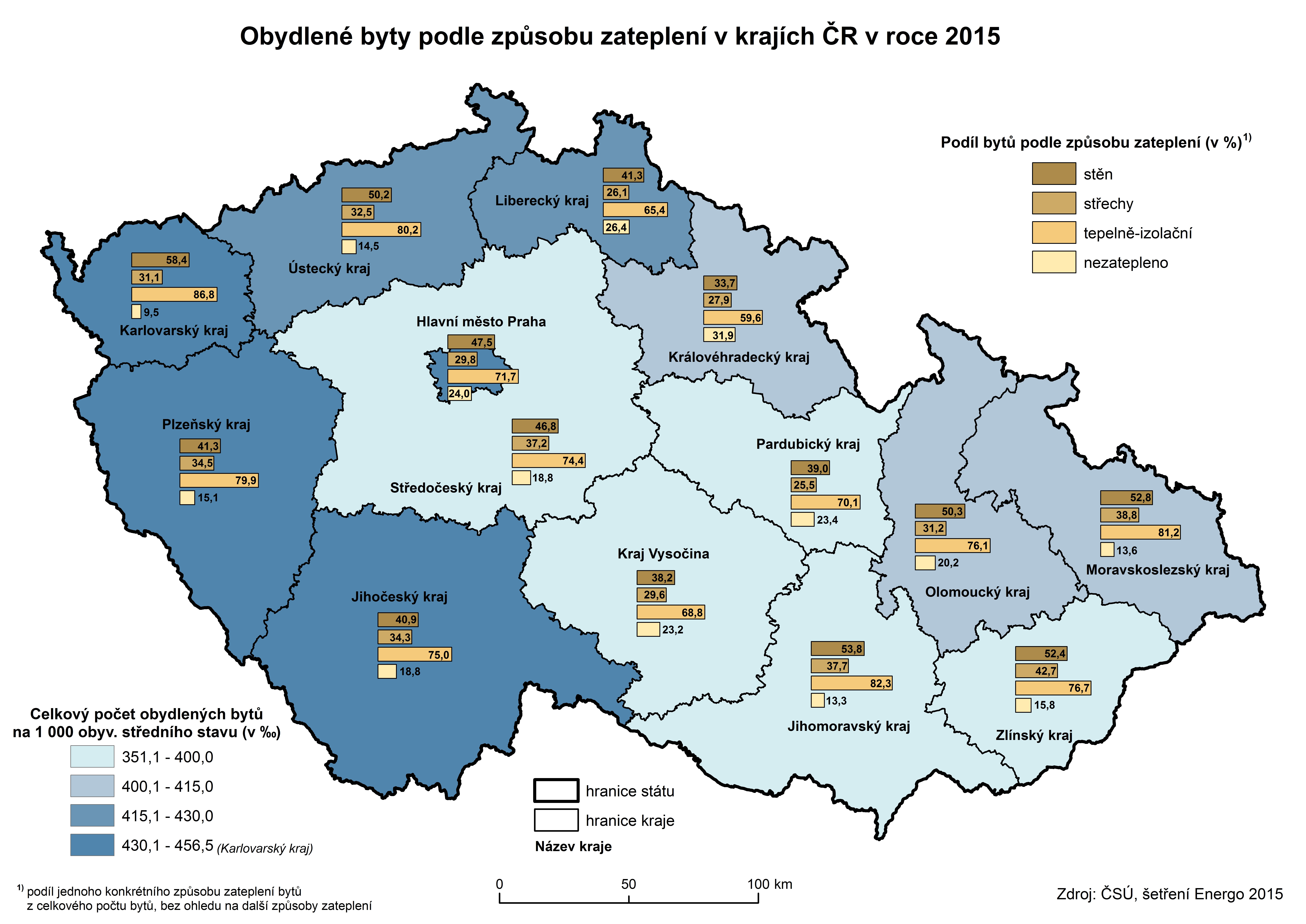Obydlené byty podle způsobu zateplení v krajích ČR v roce 2015