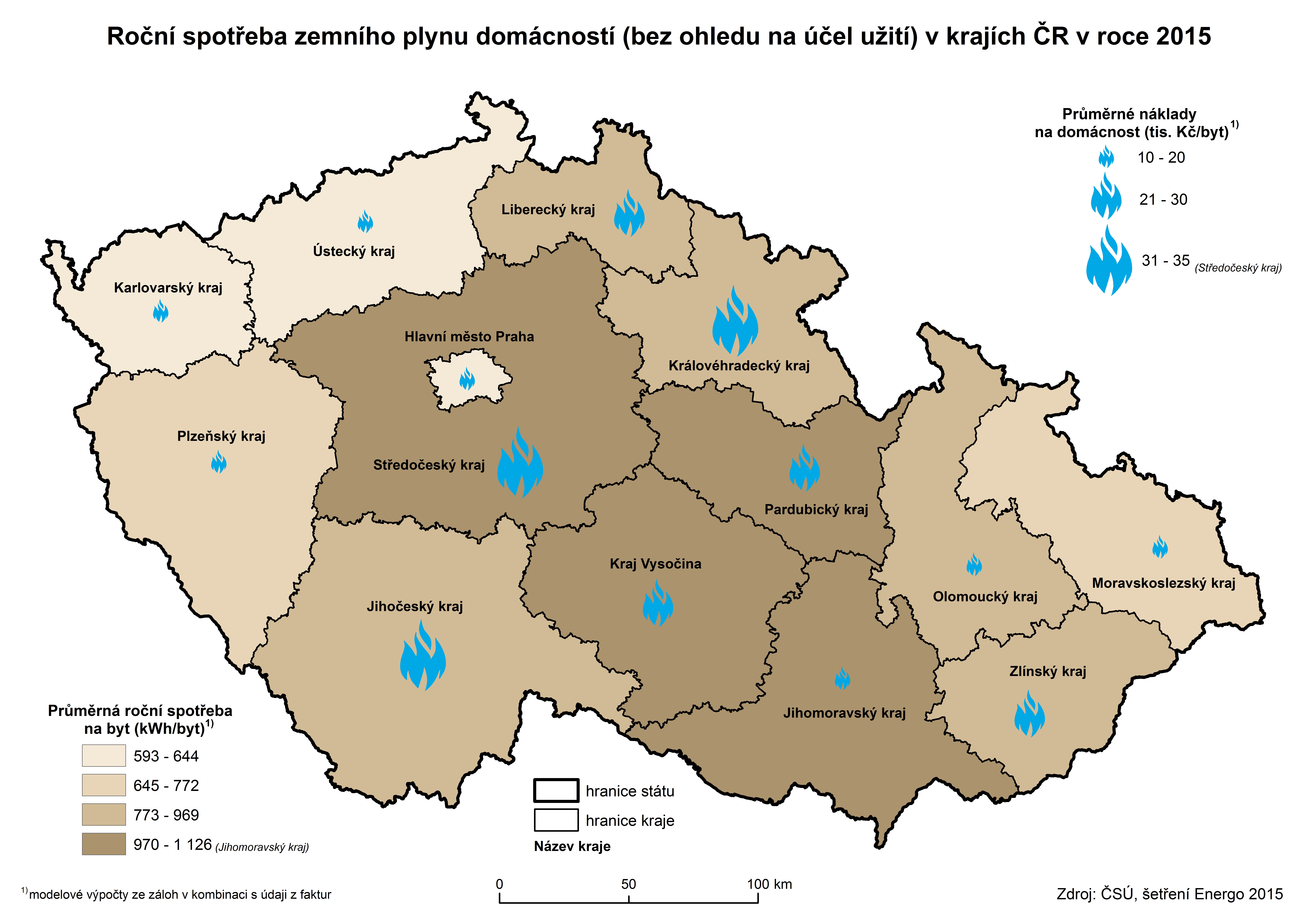 Roční spotřeba zemního plynu domácností (bez ohledu na účel užití) v krajích ČR v roce 2015
