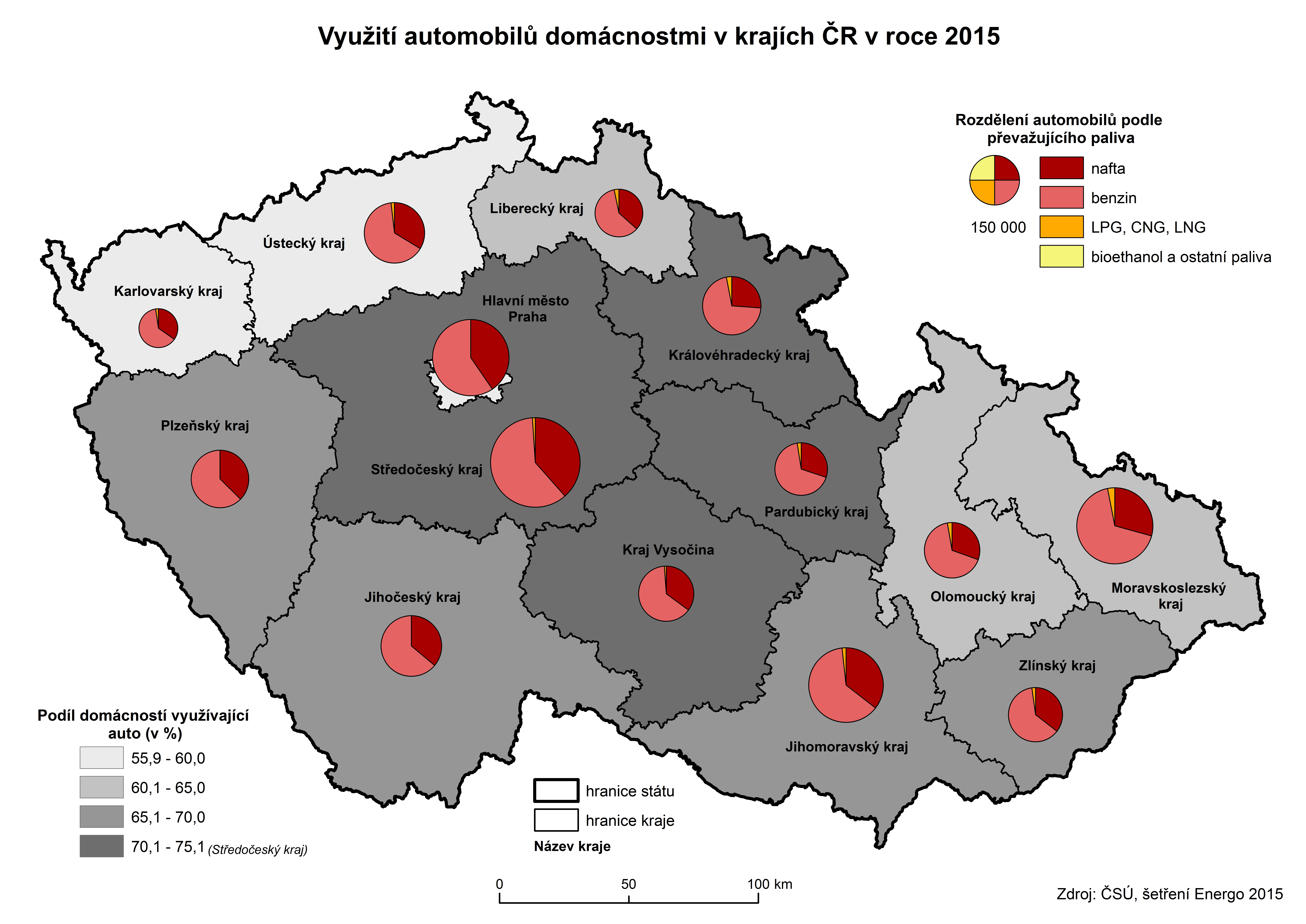 Využití automobilů domácnostmi v krajích ČR v roce 2015