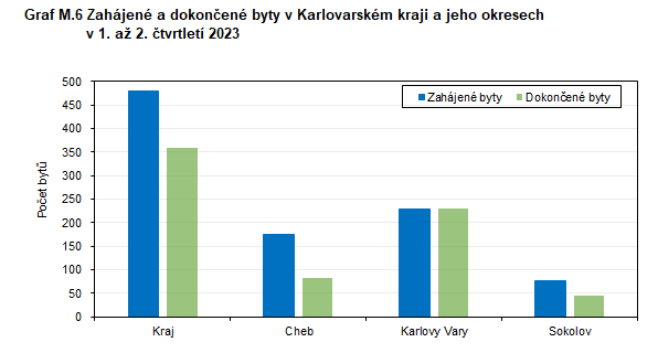 Graf M.6 Zahájené a dokončené byty v Karlovarském kraji a jeho okresech v 1. až 2. čtvrtletí 2023