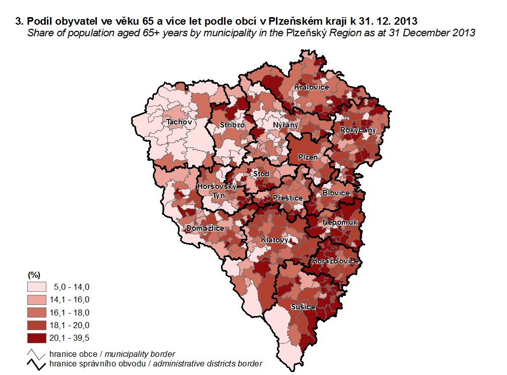 3. Share of population aged 65+ years by municipality in the Plzeňský Region as at 31 December 2013