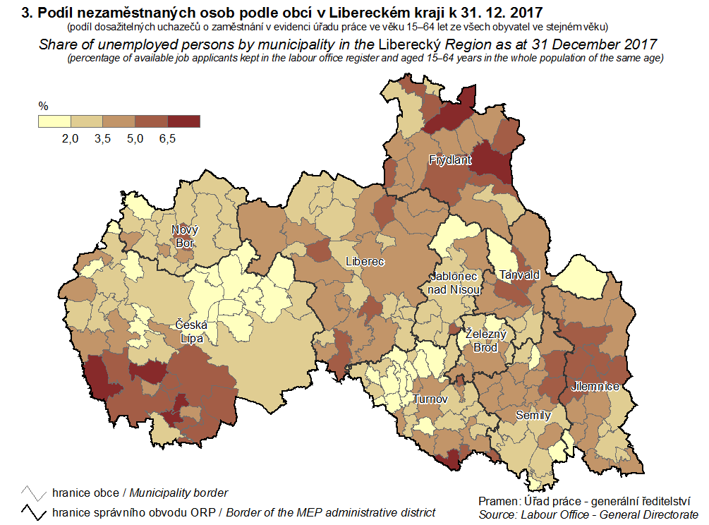 3. Podíl nezaměstnaných osob podle obcí v Libereckém kraji k 31. 12. 2017