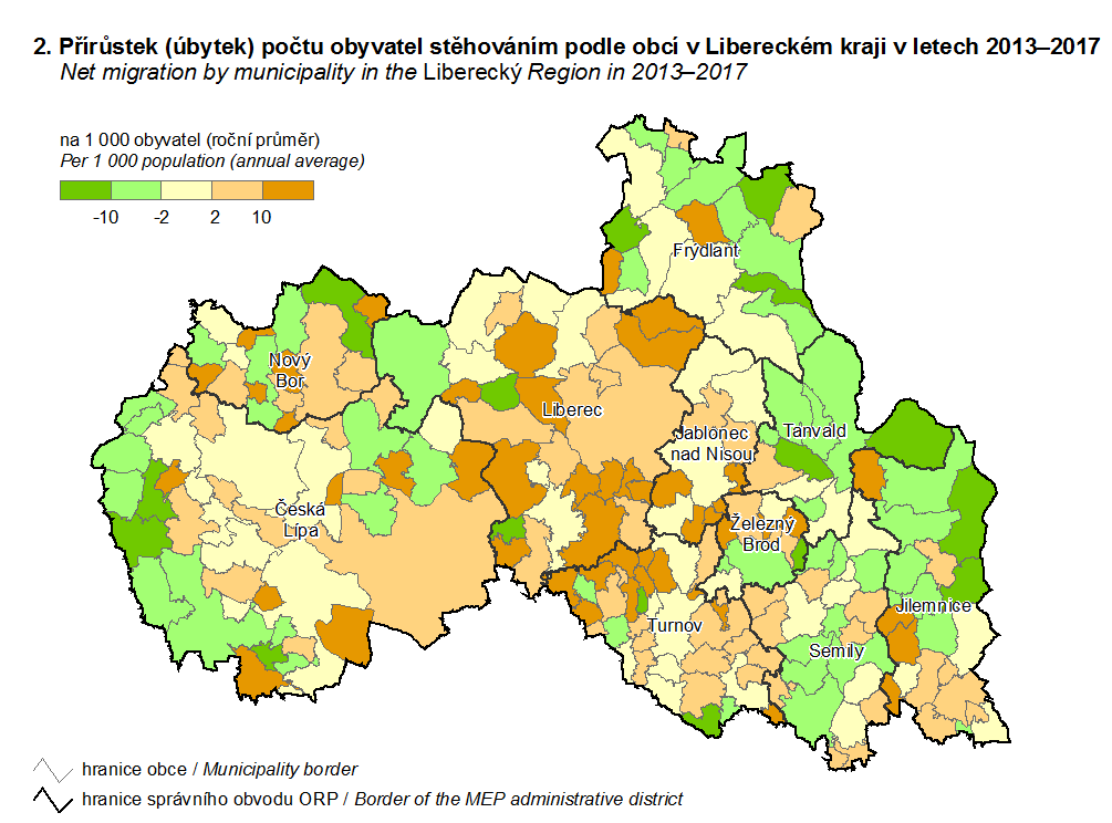 2. Přírůstek (úbytek) počtu obyvatel stěhováním podle obcí v Libereckém kraji v letech 2013–2017