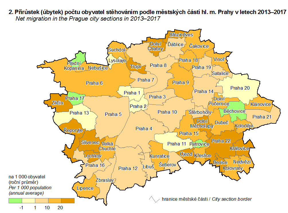 2. Přírůstek (úbytek) počtu obyvatel stěhováním podle městských částí hl. m. Prahy v letech 2013–2017