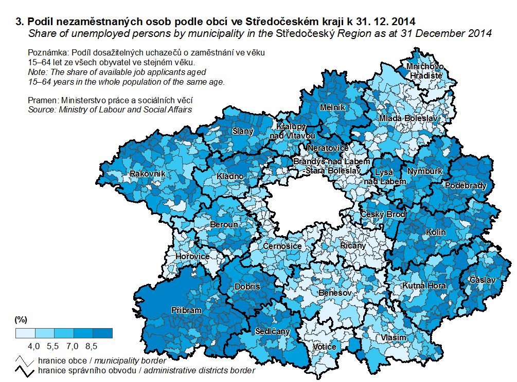3. Podíl nezaměstnaných osob podle obcí ve Středočeském kraji k 31. 12. 2014