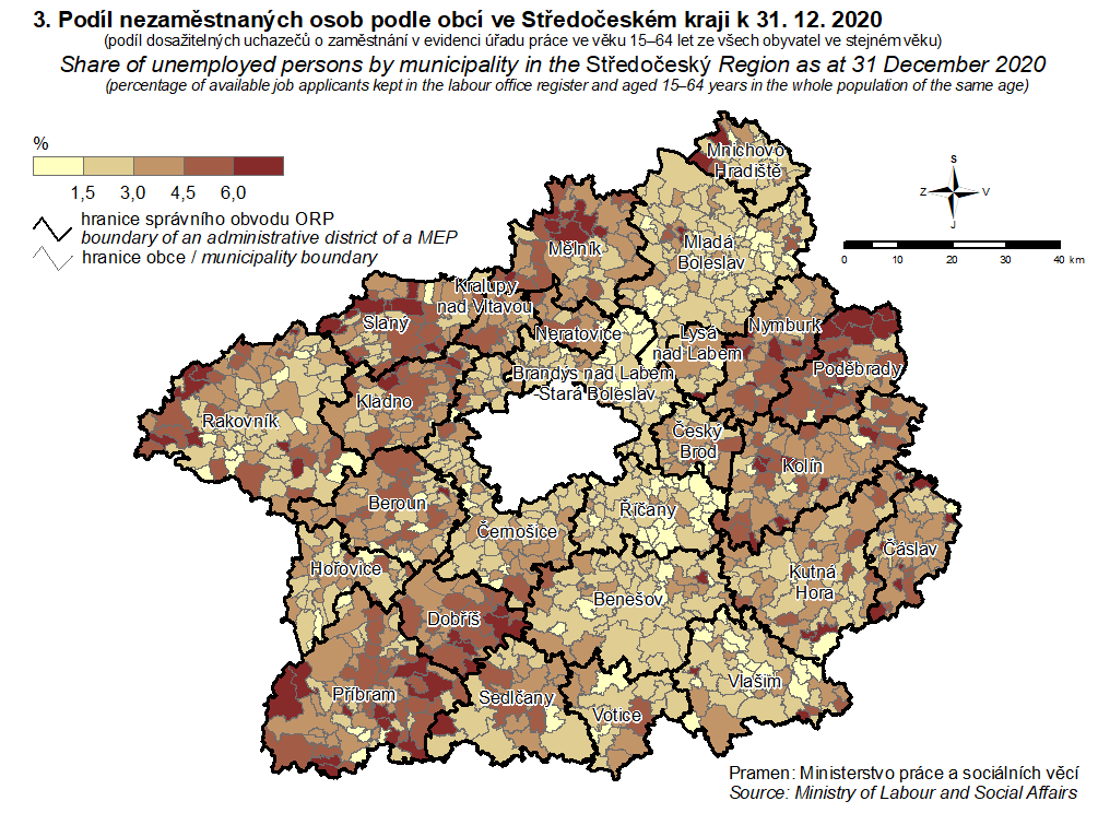 3. Podíl nezaměstnaných osob podle obcí ve Středočeském kraji k 31. 12. 2020