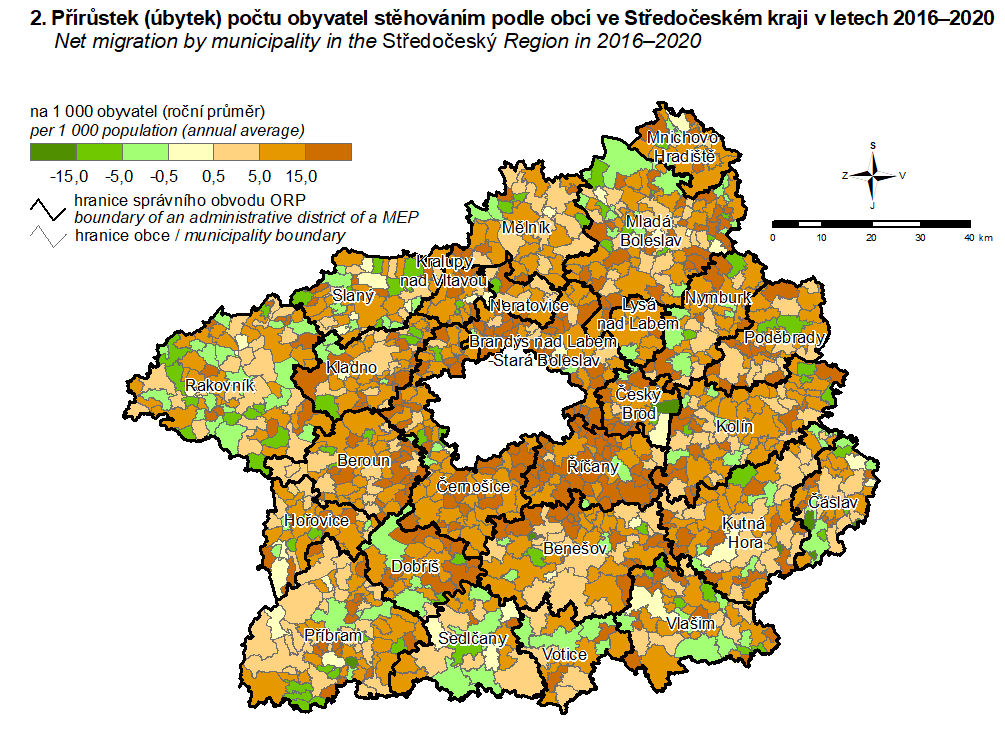 2. Přírůstek (úbytek) počtu obyvatel stěhováním podle obcí ve Středočeském kraji v letech 2016–2020