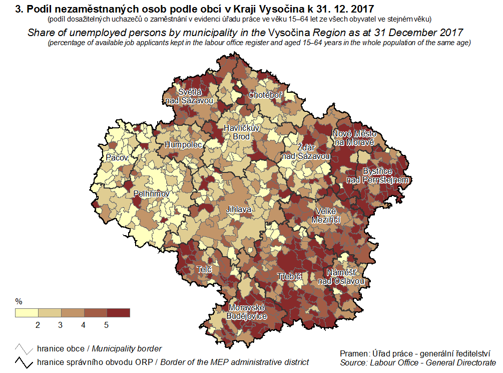 3. Podíl nezaměstnaných osob podle obcí v Kraji Vysočina k 31. 12. 2017