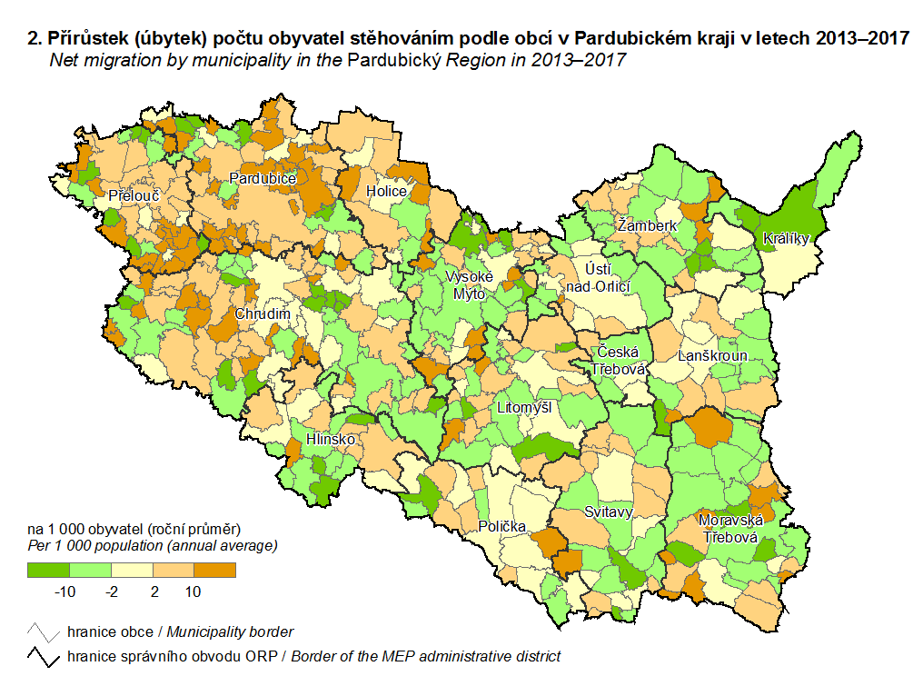 2. Přírůstek (úbytek) počtu obyvatel stěhováním podle obcí v Pardubickém kraji v letech 2013–2017