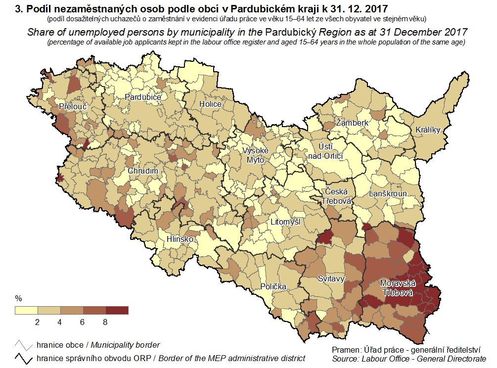 3. Podíl nezaměstnaných osob podle obcí v Pardubickém kraji k 31. 12. 2017