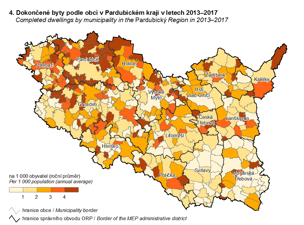 4. Dokončené byty podle obcí v Pardubickém kraji v letech 2013–2017