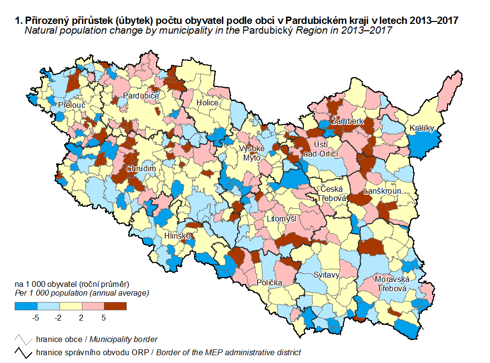 1. Přirozený přírůstek (úbytek) počtu obyvatel podle obcí v Pardubickém kraji v letech 2013–2017