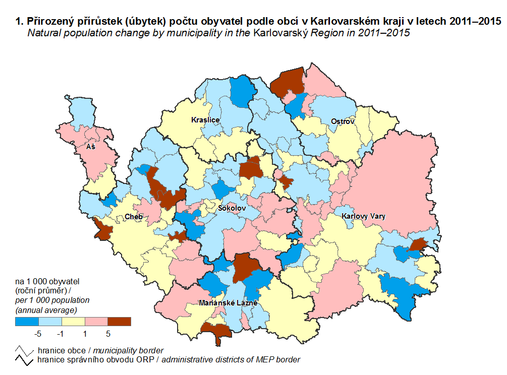1. Přirozený přírůstek (úbytek) počtu obyvatel podle obcí v Karlovarském kraji v letech 2011–2015