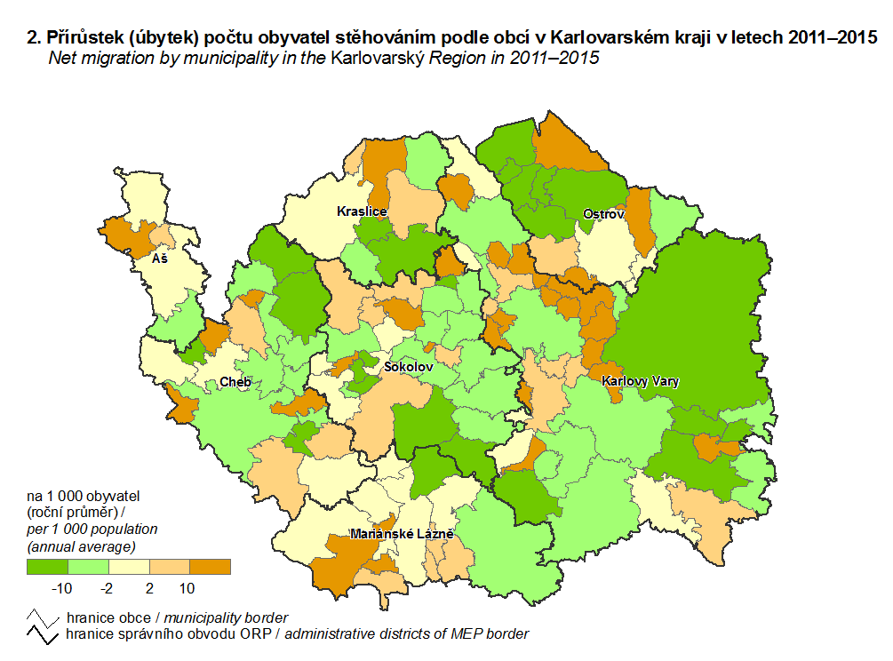 2. Přírůstek (úbytek) počtu obyvatel stěhováním podle obcí v Karlovarském kraji v letech 2011–2015